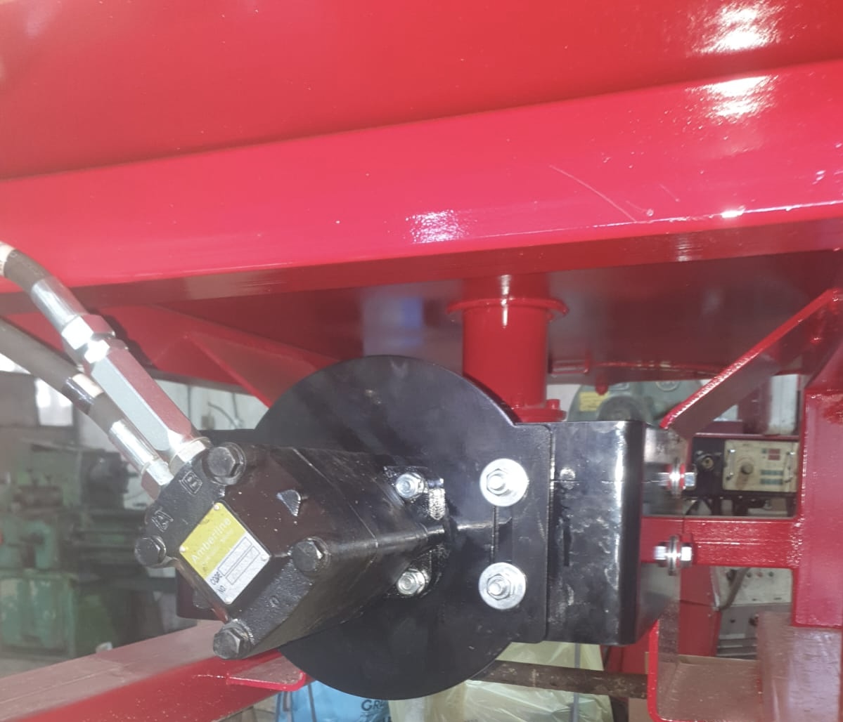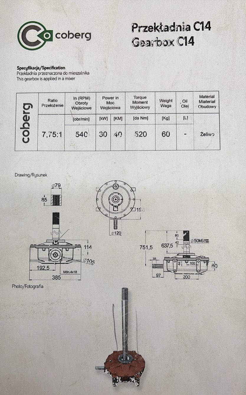Der Antrieb erfolgt über die Traktorzapfwelle ab 45 PS bei 540 Umdrehungen pro Minute. Das verbaute Getriebe C14 mit einer Übersetzung von 7,75 : 1 sorgt für eine Mischgeschwindigkeit von ca. 26 Umdrehungen pro Minute, wodurch Beton und Mörtel gleichmäßig und zuverlässig durchmischt werden (siehe Datenblatt in der Bildergalerie). Eine Aufsteckpumpe mit 40 Litern Förderleistung unterstützt den hydraulischen Betrieb.